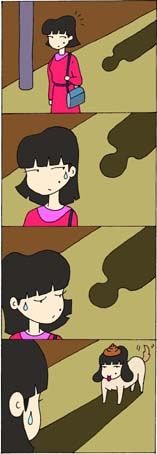 本日の4コママンガ タイトル「追跡者」女性の後についてくる怪しい影の正体は?。シュールな4コマ