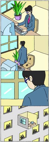 本日の4コママンガ タイトル「窓際」出世競争に敗れたサラリーマン。居場所は本当に窓際だった。シュールな4コマ
